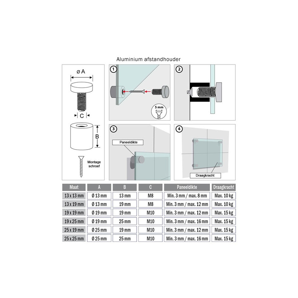The 13x19 mm aluminium board fixing spacer provides a defined, repeatable offset from the wall, helping you keep boards perfectly aligned and visually consistent across an installation.