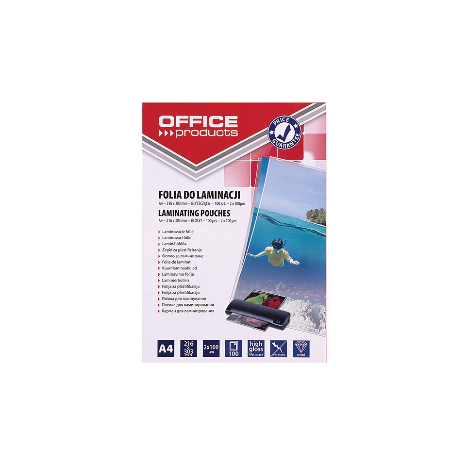 High-quality OFFICE products laminating pouches in A4 format, with a total thickness of 200 microns (2 x 100 microns), ideal for protecting important documents from liquids, moisture, dirt, and dust. Supplied in a pack of 100 pieces, suitable for use in most standard laminating machines.