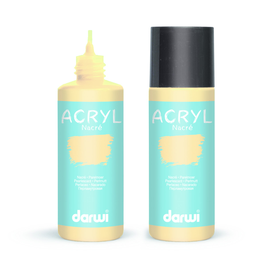 Darwi Flacon de 80 ml de Peinture Acrylique Universelle Nacrée La peinture acrylique universelle DARWI offre de nombreuses possibilités créatives pour les artistes amateurs, professionnels et passionnés de loisirs créatifs. Idéal sur tous les supports, elle s'adapte à toutes les envies créatives ! Les couleurs nacrées offrent une douce iridescence qui rappelle la lueur des perles. La gamme comprends 8 teintes miscibles, couvrantes et de viscosité moyenne. Avant utilisation, bien secouer le flacon. Il est également recommandé de dégraisser et nettoyer la surface à peindre. La peinture peut s'appliquer à l'aide d'un pinceau ou d'une éponge mais aussi directement au tube grâce à son embout-applicateur ajoutant ainsi du relief aux créations. La peinture se dilue et se nettoie à l'eau. Conserver le produit à une température comprise entre 5 et 25 degrés.