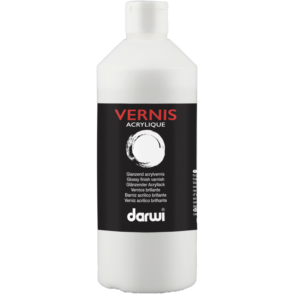 DARWI Flacon de 500 ml Vernis Acrylique, finition Brillante Protégez et sublimez vos créations avec notre Vernis Acrylique Brillant, spécialement conçu pour offrir une finition impeccable et durable. Ce vernis à base d'eau, prêt à l'emploi, est idéal pour une application simple et rapide sur une grande variété de supports, tels que bois, métal, papier, céramique ou toile. Sa formule multi-supports et son séchage rapide permettent un gain de temps précieux tout en garantissant un résultat professionnel. Une fois sec, il devient entièrement transparent, mettant en valeur vos couleurs et vos textures sans altérer l'aspect de vos créations. Sa finition brillante apporte un éclat lumineux, parfait pour sublimer vos oeuvres et leur donner une touche élégante et raffinée.