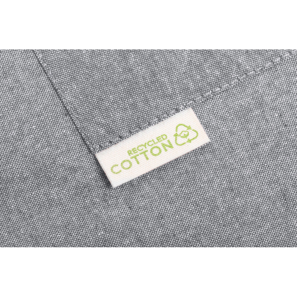The apron is crafted from 100% recycled cotton, providing an eco-friendly option for both personal and promotional use.