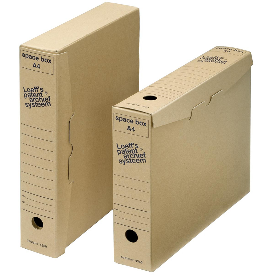 Loeff's Space Box is a ready-to-use archive box measuring 320 x 240 x 60 mm, designed for secure, dust-free storage. Constructed in sturdy cardboard, it is ideal for holding the contents of a single lever arch file. Supplied in a pack of 50 units, this box is suitable for professional archiving and office organization.