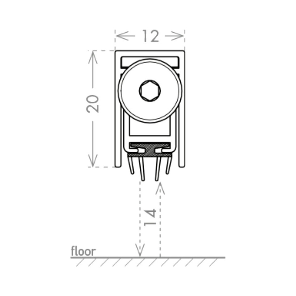 When the door closes, the self-directing push button presses against the frame or an external stop, lowering the internal sliding profile in a guillotine motion until the seal makes continuous contact with the floor. This blocks drafts, dust, and noises regardless of the floor type.
