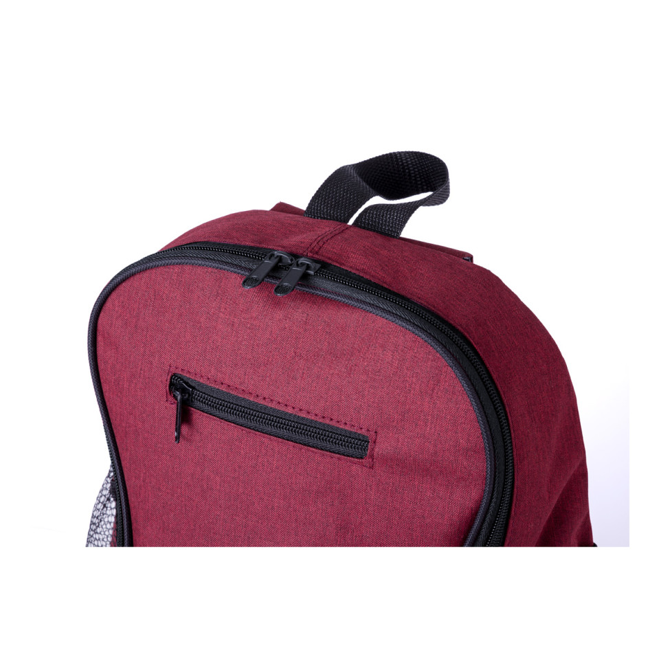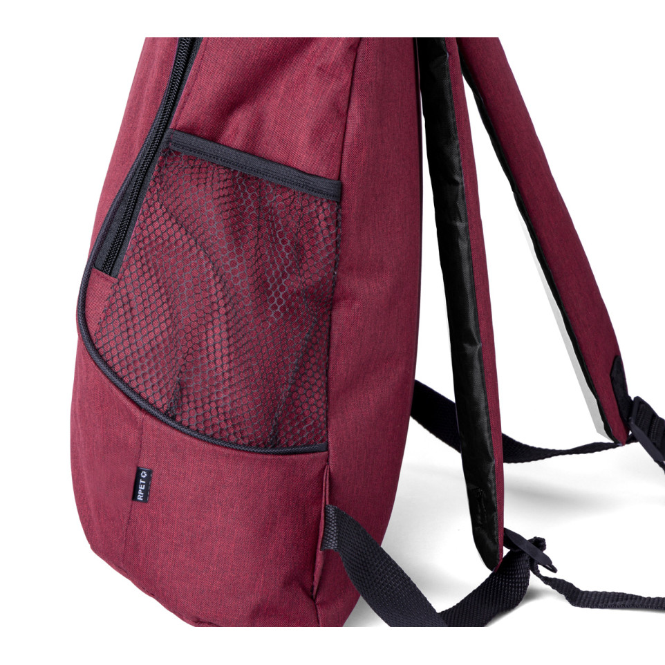 The Arkas red RPET backpack is a versatile daily companion designed with a spacious zipped main compartment, a convenient front pocket, and mesh side pockets for added utility. It offers comfort with a padded back and adjustable shoulder straps, making it ideal for work, school, or leisure activities.