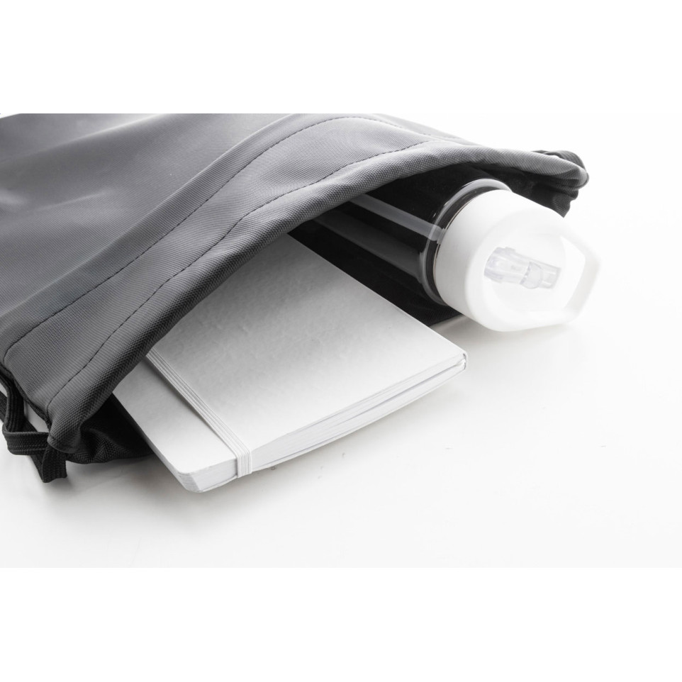 Versatile RPET drawstring bag featuring a sleek black design with PU coated front panel and practical zippered pocket. Perfect for daily commutes, gym sessions, or eco-conscious promotional campaigns.