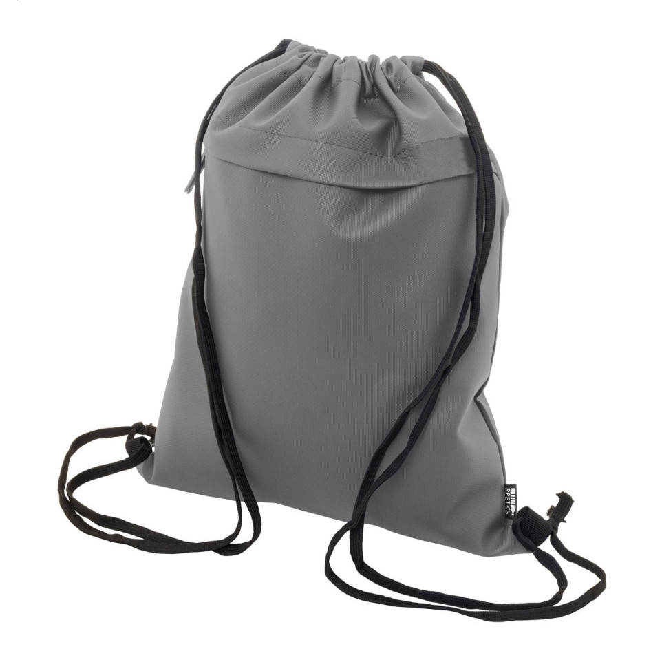 The Pudrow grey RPET drawstring bag is a versatile eco-friendly backpack featuring a durable design with a PU-coated front section and convenient zippered pocket, perfect for everyday use, casual outings, or promotional events.