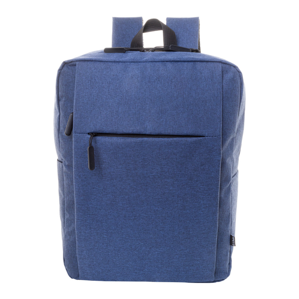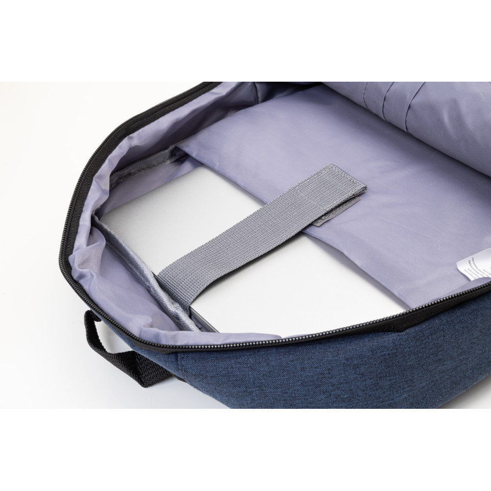The Prenson blue RPET backpack is a practical and eco-friendly solution for daily commutes and business use, featuring a main compartment, two front zipped pockets, a side pocket, and a padded section for a 15" laptop.