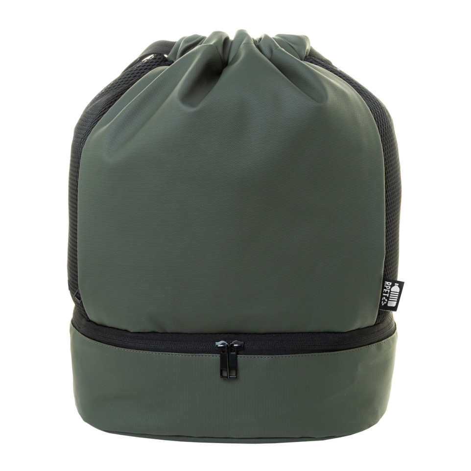 The Duodraw green RPET drawstring bag is a versatile backpack designed for daily commutes, gym sessions, or casual use, featuring a dedicated shoe compartment, mesh inlays, and ergonomic wide straps for comfortable carrying.