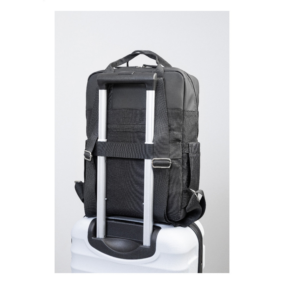 - Features include a zipped main compartment, zipped front pocket, side pockets, anti-theft pocket, trolley strap, and 15" padded laptop compartment.