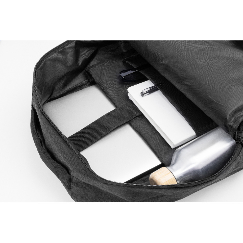 Black RPET backpack designed for daily carry or business use, equipped with a spacious main compartment, three zipped front pockets, and dedicated padded spaces for a 10" tablet and a 15" laptop.