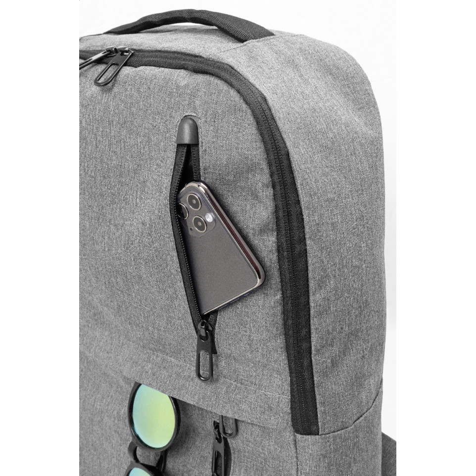 Lauder grey RPET backpack offers efficient organization with a main compartment, three zipped front pockets, and padded sections for a 10" tablet and 15" laptop—ideal for daily commutes, business meetings, and travel.