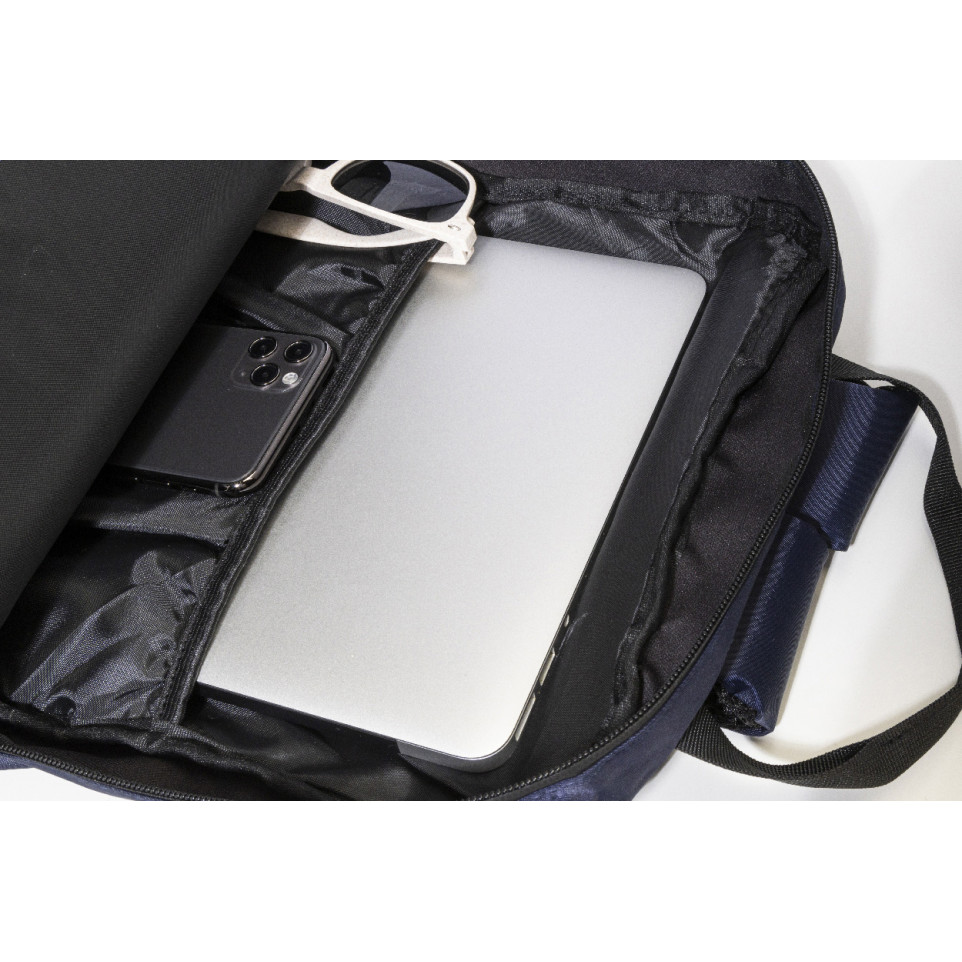 The Westing dark blue RPET twill backpack is a versatile, eco-friendly bag featuring a spacious main compartment, two zippered front pockets, a padded 15" laptop section, and mesh side pockets—ideal for daily commutes, business travel, or outdoor use.
