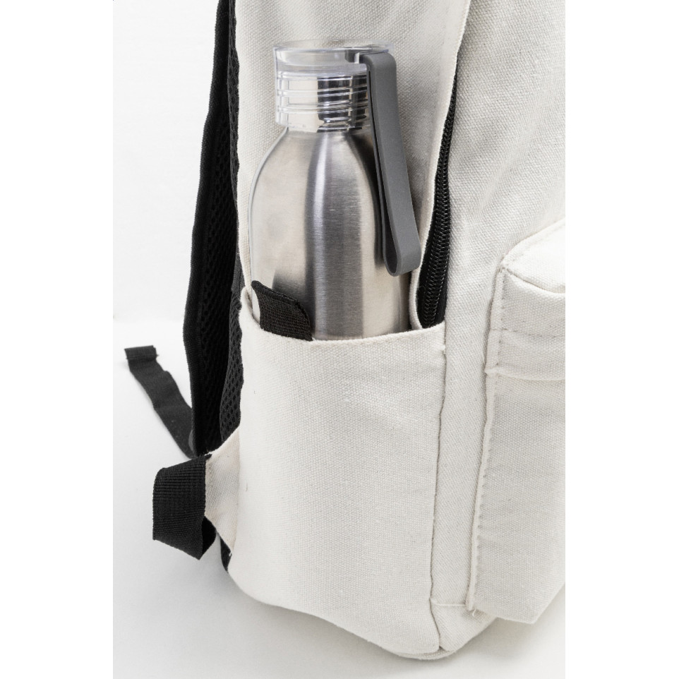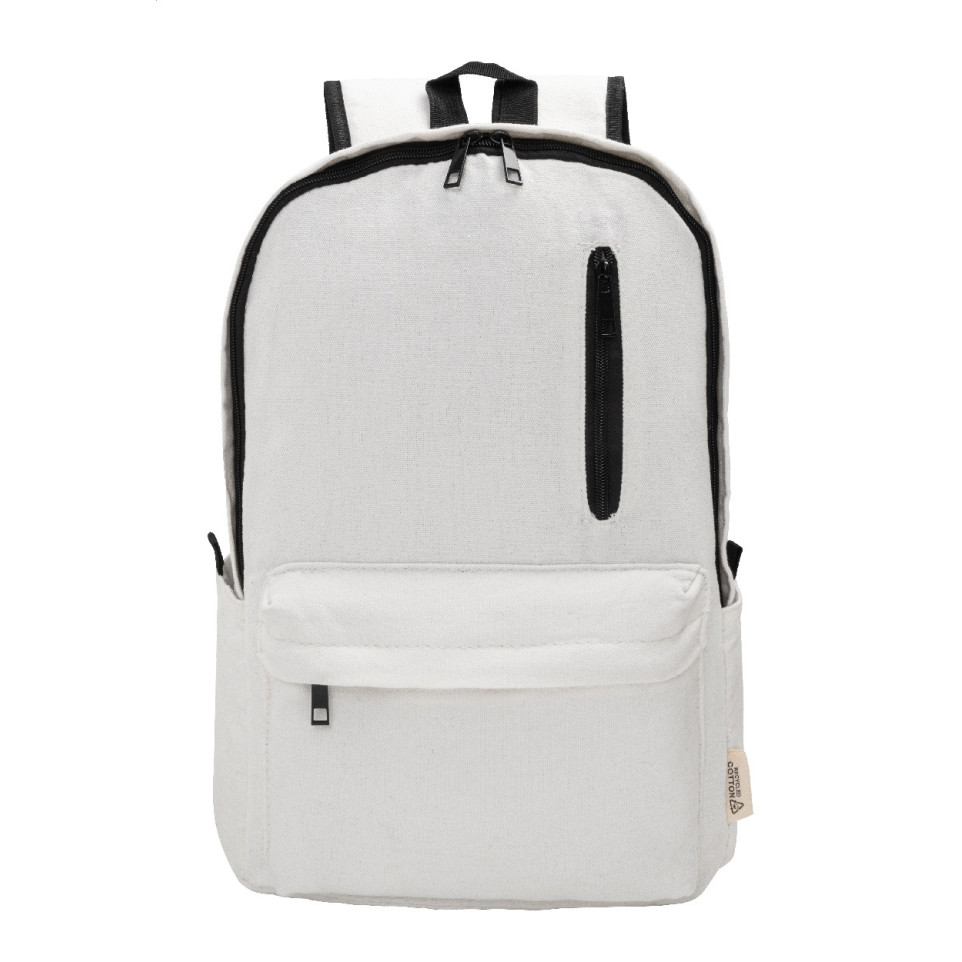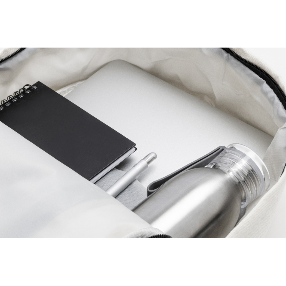 White recycled canvas backpack featuring a spacious zipped main compartment, a padded compartment suitable for a 15" laptop, two zipped front pockets, side pockets, padded back and shoulder straps, and a trolley strap for travel convenience.
