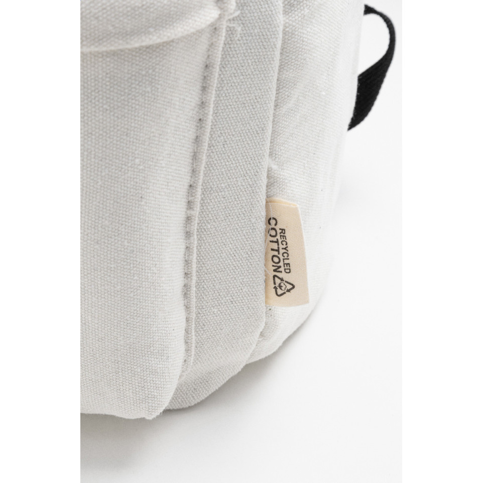 The backpack uses 70% recycled cotton and 30% recycled PET polyester, providing durability and sustainability.