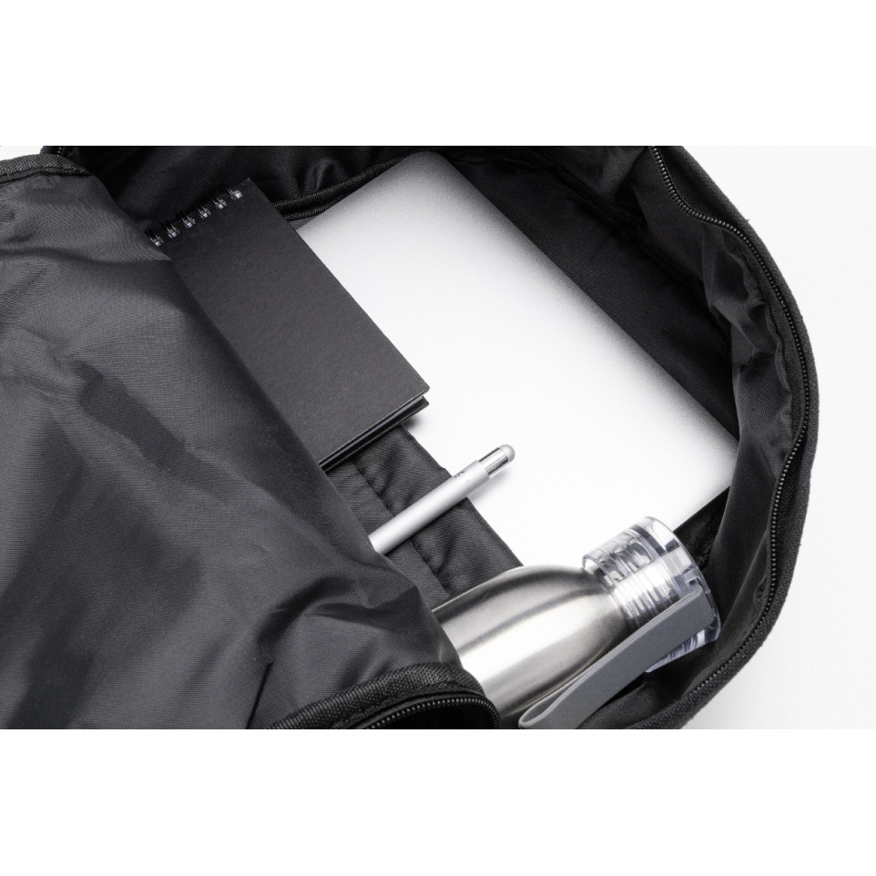 Black recycled canvas backpack designed for everyday commuting, travel, or business. Features a spacious zipped main compartment, padded 15" laptop section, two zipped front pockets, and side pockets for efficient organization.