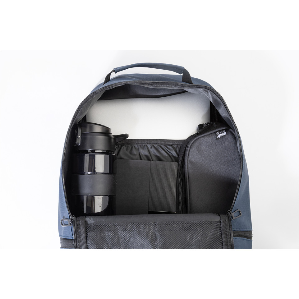 Waterproof Rhodes blue RPET backpack designed for daily commutes, work, or travel, featuring a zipped main compartment, padded 13" laptop sleeve, bottom zip pocket, and hidden side pocket for secure organization.