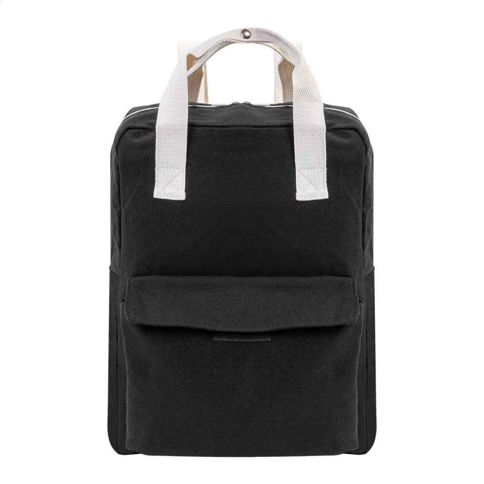 Rekan Back black recycled canvas backpack offers practical storage for daily commutes or travel, featuring a zipped main compartment, padded 13" laptop section, and front velcro pocket.[17 words]