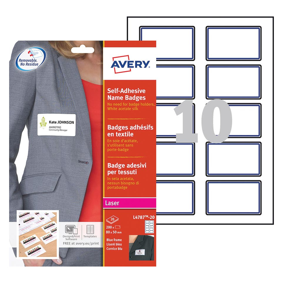 Avery L4787-20 badge adhésif ft 80 x 50 mm, boîte de 200 pièces, blanc/bleu, is used for creating self-adhesive name badges in a professional setting, such as offices, conferences, and events.