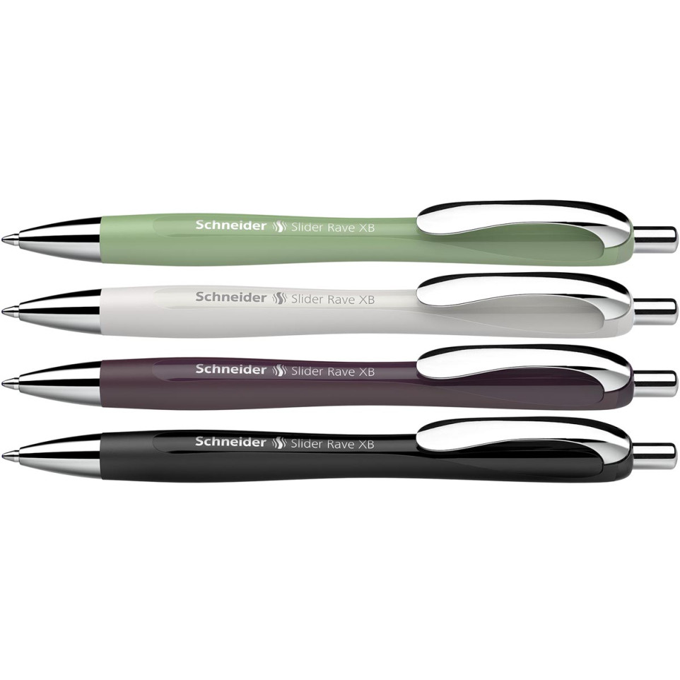 The Schneider Slider Rave Trend Edition ball pen offers extra broad 1.4 mm lines in vibrant blue ink with smooth Viscoglide® technology. Delivered as a box of 3+1 free in Organic Green, Silver Grey, Plum, and Black, it is ideal for daily writing that demands comfort and reliability.