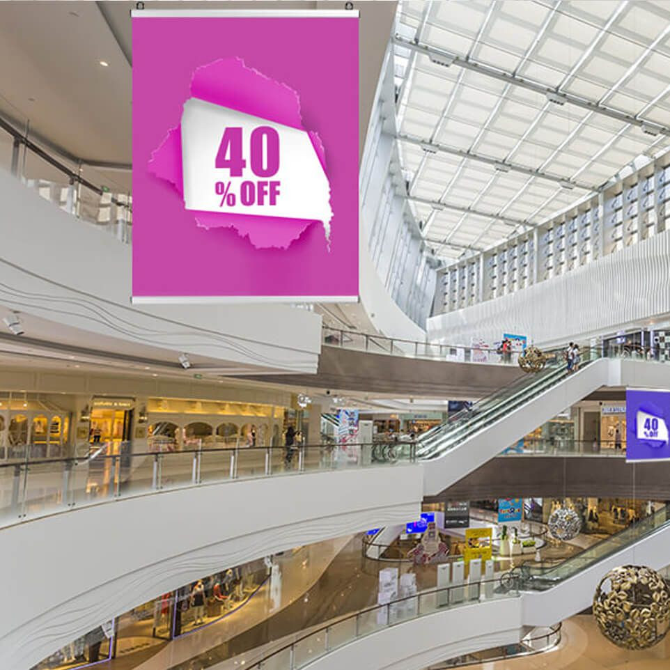 These anodized aluminum suspension profiles are very easy to use. Depending on your needs, you can easily interchange your visuals in less than one minute. They hang naturally by means of the eyelets integrated in the upper profile. Black rubber covers complete the finish and the protection of the elements.