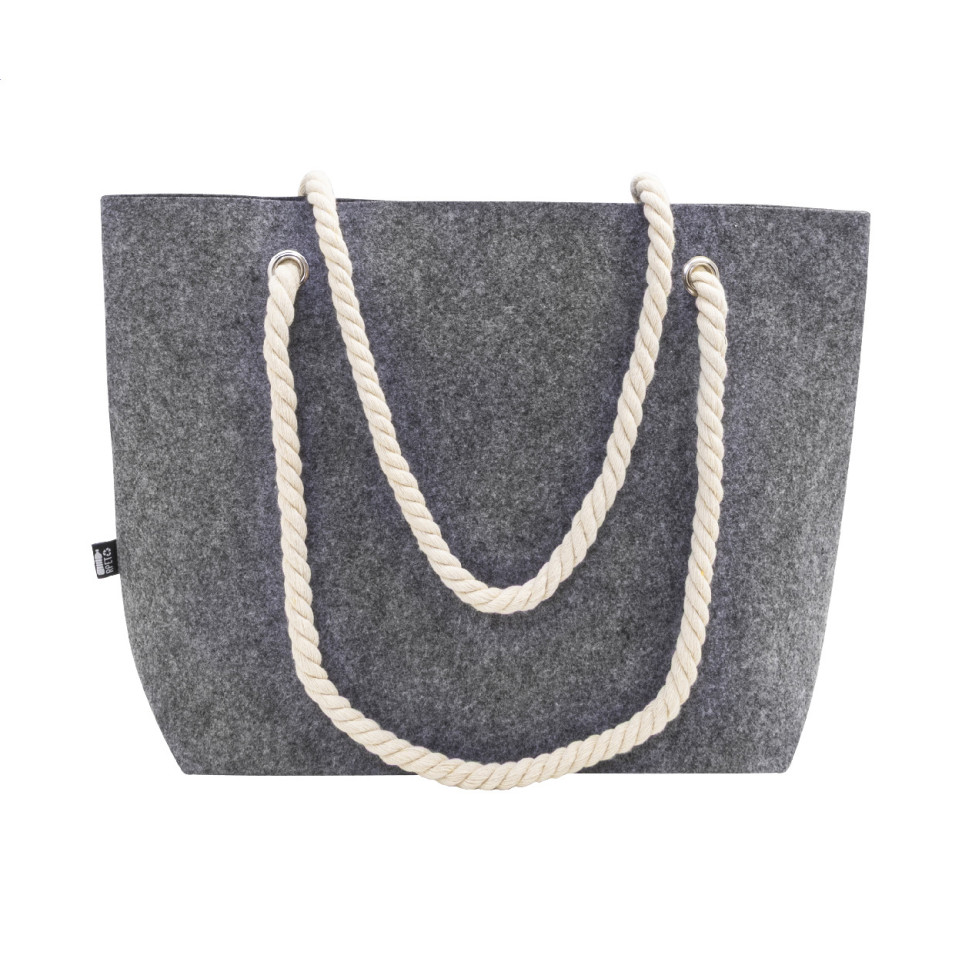 The Refelt Beach Grey RPET beach bag is a versatile felt bag designed for beach outings or shopping trips, featuring a sturdy cotton cord handle and bottom gusset for enhanced stability and comfort.