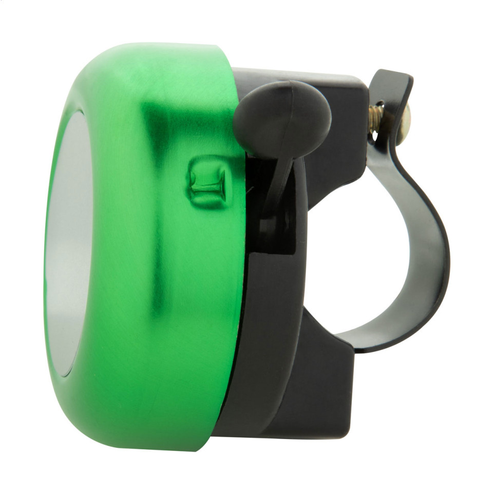 Rush green bicycle bell is an elegant aluminum cycling accessory featuring a silver plate for customization. Perfect for urban cyclists who want to combine safety with style while navigating busy streets.