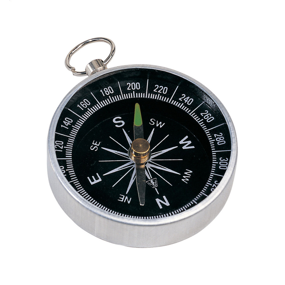 Compact metal compass with an integrated ring, designed for easy carrying and reliable orientation in outdoor, travel, or promotional contexts.