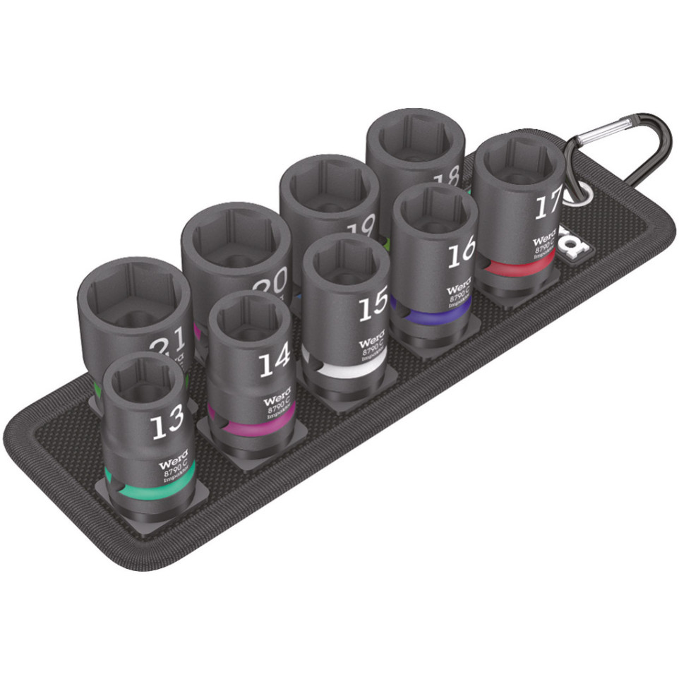 - Sockets made from robust steel alloy with a black finish optimized for high load endurance. Includes sizes: 13, 14, 15, 16, 17, 18, 19, 20, and 21 mm. Socket length: approx. 38 mm each.