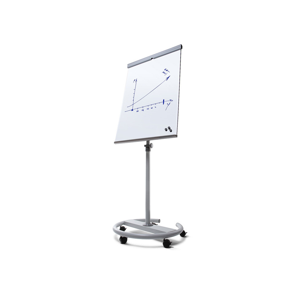 Adjust the flipchart height according to your needs using the telescopic mechanism. Write or attach notes using magnets on the steel panel. The circular base with lockable castors allows stable positioning and easy movement within rooms. Use the retractable arms to attach extra sheets and keep your markers handy in the pen tray.