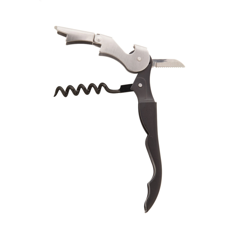The Umbria black silver wine opener is a compact metal corkscrew with an integrated bottle opener, ideal for efficiently opening wine bottles or other beverages in hospitality, home, or event settings.
