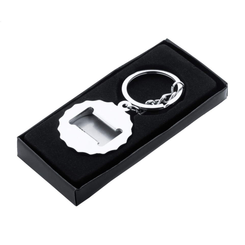 This sleek, cap-shaped metal keyring doubles as a practical bottle opener, combining everyday utility with stylish design. Presented in an elegant black gift box, it's perfect for both personal use and corporate gifting.