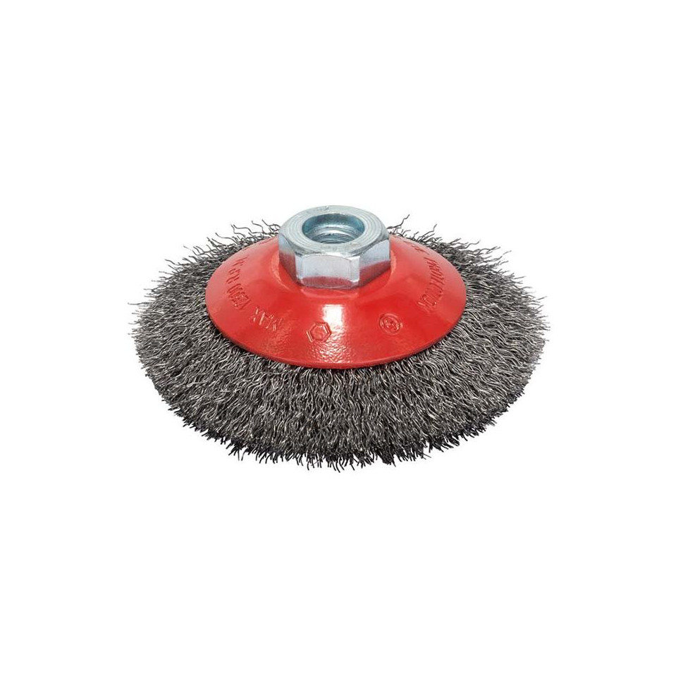 This conical brush with crimped wires is designed for use with angle grinders to clean, remove rust, paint, and surface coatings from metal parts efficiently. Ideal for preparing surfaces before welding or painting.
