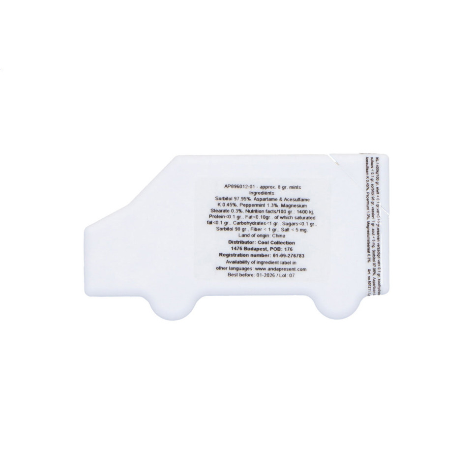 TruckMint white mint dispenser is a truck-shaped plastic container filled with approximately 8 grams of sugar-free menthol candies, perfect for freshening breath on the go or as a unique promotional item.