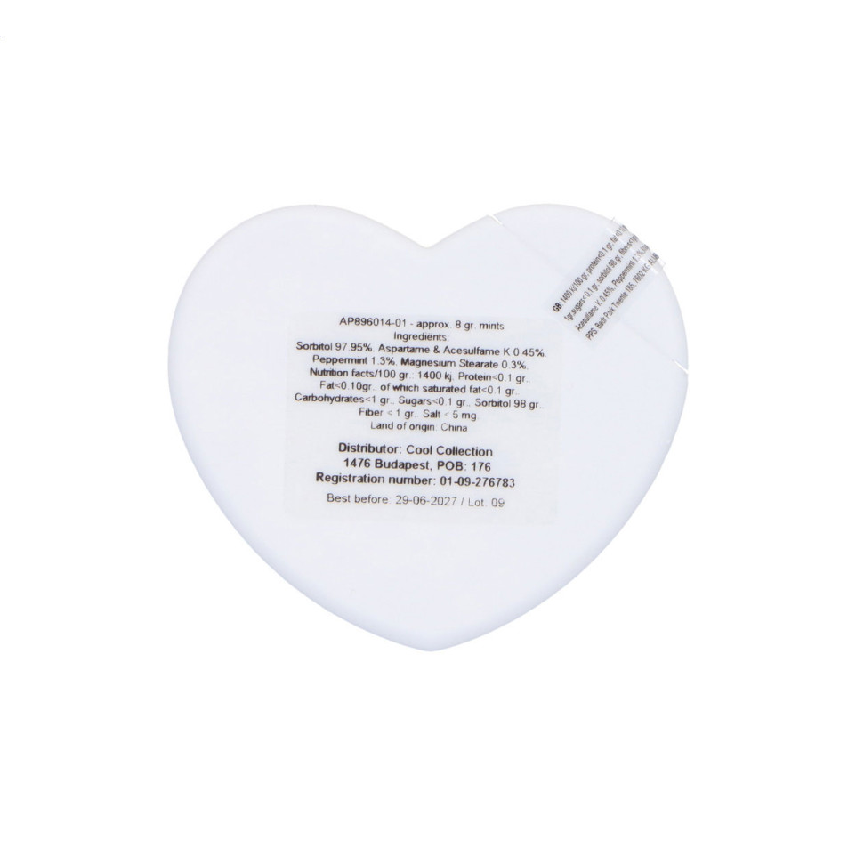 Heart shaped plastic mint dispenser filled with approximately 8 grams of sugar-free menthol candies. Perfect for freshening breath on-the-go while showcasing your brand in a memorable shape.