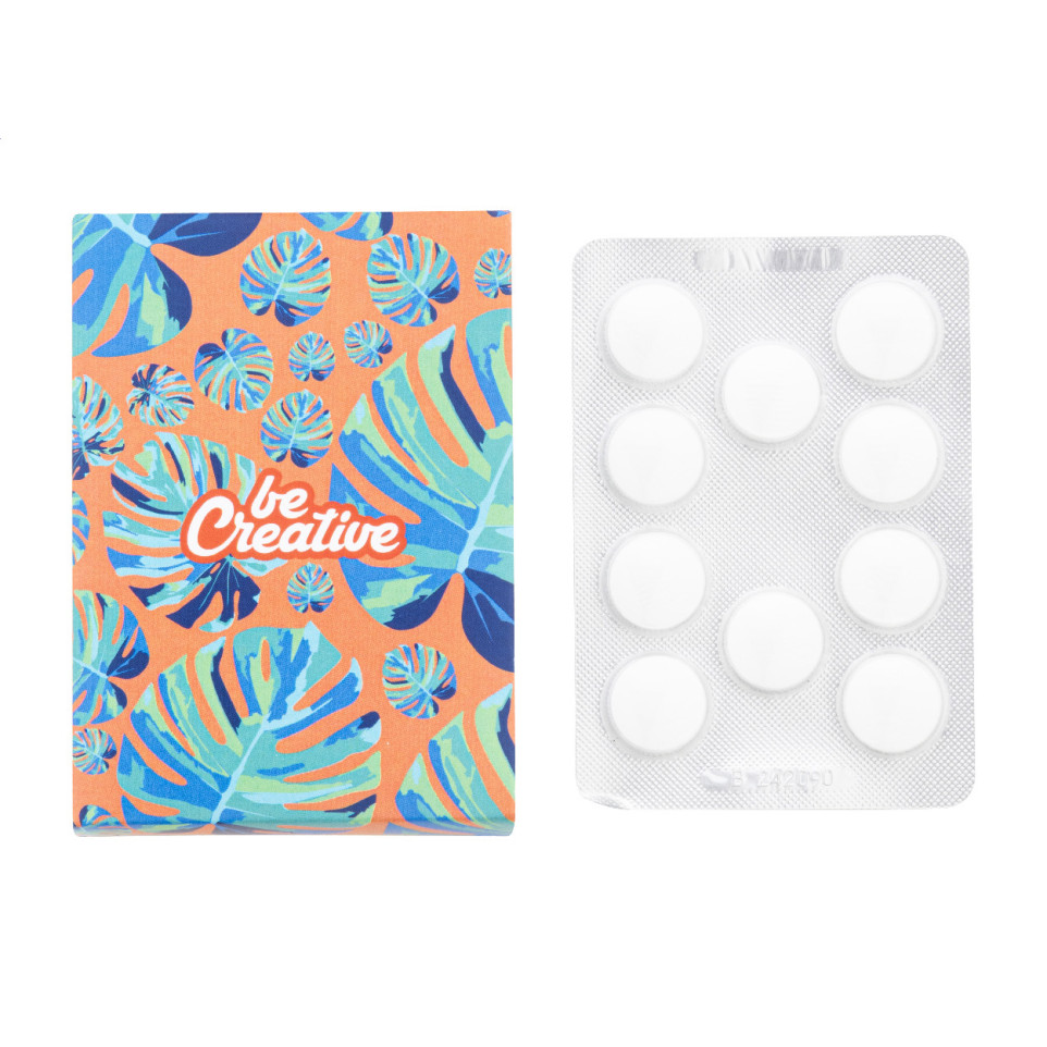 CreaMint 10 white custom mint candies offer ten large-sized mint candies, conveniently packed in a blister and enclosed in a custom-made, full color printed paper box. Ideal for customer gifting or event giveaways.