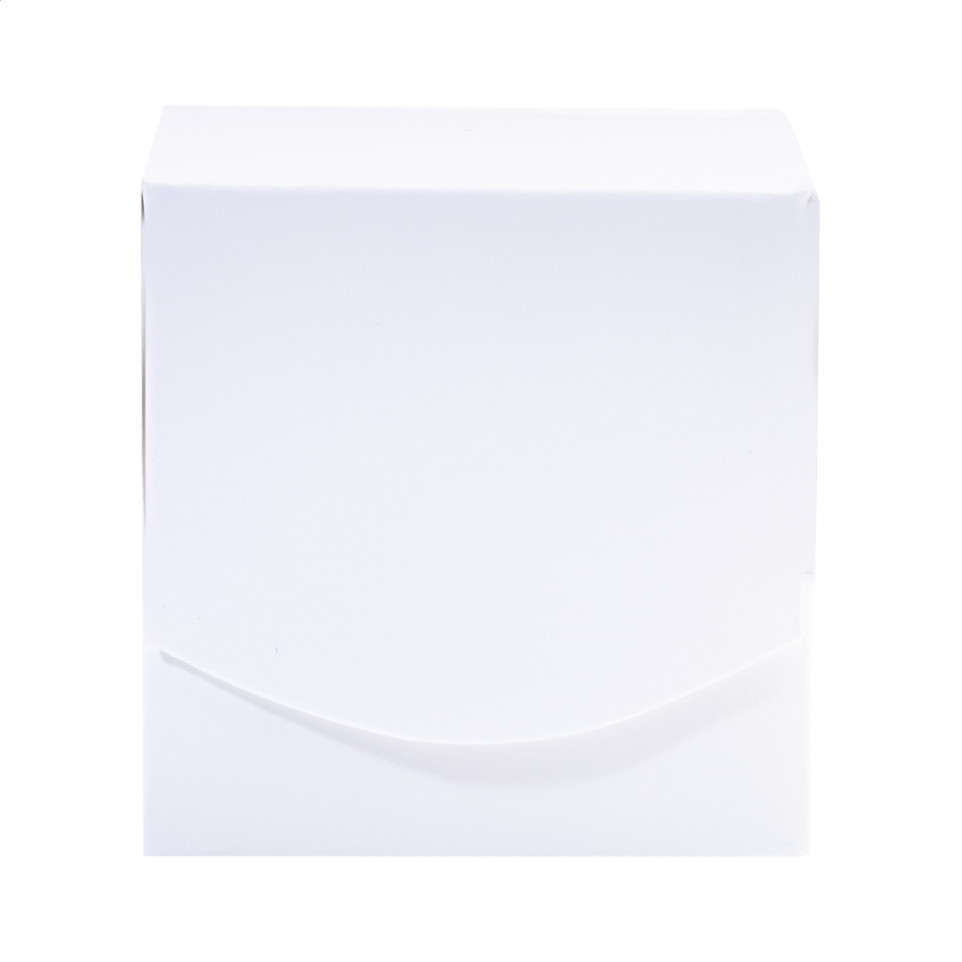 Cube-shaped candy dispenser box filled with 40 grams of individually wrapped mixed fruit candies, featuring all-over full color printing for custom branding. Ideal for promotional giveaways at events or offices.