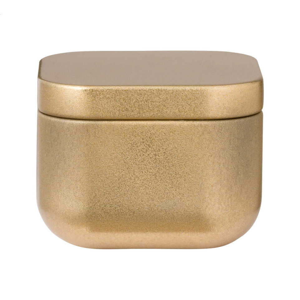 Vanilla scented candle presented in a gold-tone metal tin box, ideal for creating a warm and inviting ambiance at home, in offices, or during events.