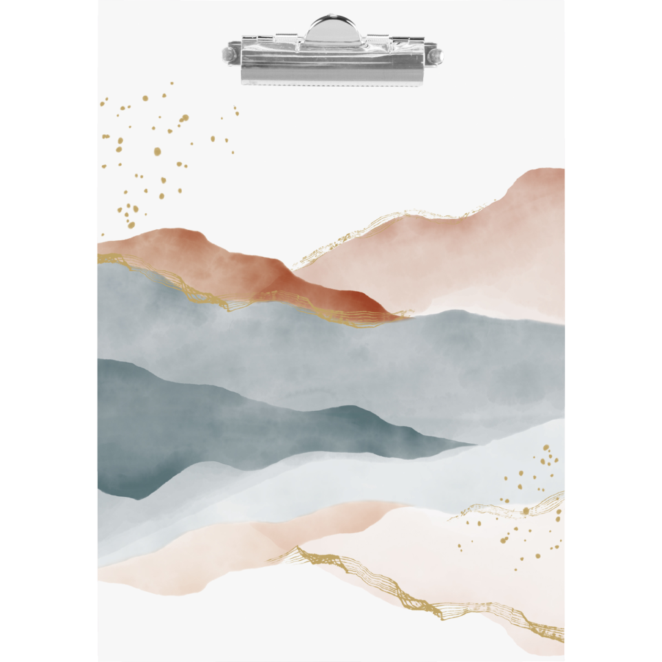 Evanescence, Porte-bloc 23x33cm Edith Duprez-Chenu est créatrice de motifs et illustratrice chez Edith and Co Design. Passionnée par les couleurs, les matières, les motifs dans tout ce qui l'entoure, Edith Duprez s'efforce de capturer la beauté de la vie à travers des coups de pinceau fluides et intuitifs. Pour cela, elle affectionne particulièrement l'aquarelle, ce medium qui a sa propre expression, sa délicatesse et qui révèle des couleurs imprévisibles ! Dans cette nouvelle collection, Edith mêle formes géométriques et abstraites, line art et paysages aquarellés dans des nuances de rose, beige, ocre et bleu. Ces teintes poudrées sont sublimées par des touches dorées pour un rendu plein de douceur. 1 visuel paysage bleu. Fabriqué à base de carton certifié PEFC, pelliculage satiné, sérigraphie or. Pratique, il est suffisamment rigide pour permettre la prise de note en toute situation. Un petit trou derrière la pince permet d'accrocher le porte-bloc sur un crochet mural.