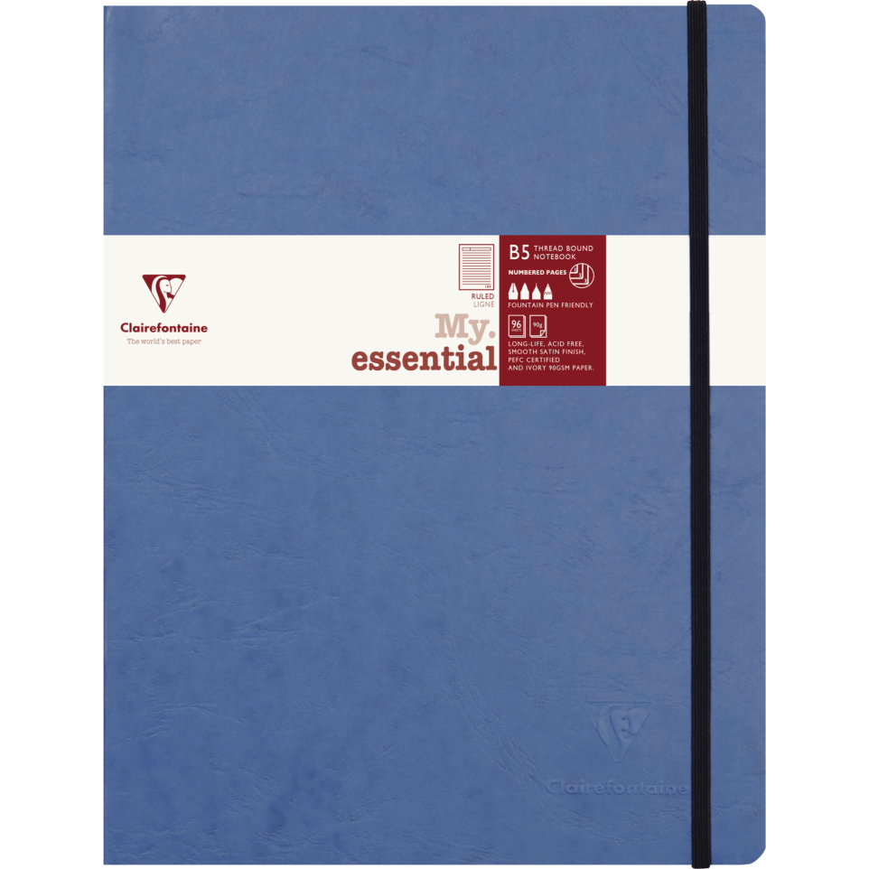 Age Bag My Essentials Thread Bound Notebook B5 Lined These Age Bag notebooks are perfect for everyday use With 192 pages of Clairefontaine brushed vellum ivory 90gsm paper, 184 numbered pages and table of contents on 8 pages Premium deep dyed pressboard covers with leather effect. Certified PEFC The last 8 sheets are micro-perforated detachable. Elastic closure matching the cover colour Coordinate ribbon book mark, printed endpapers and 2 storage pockets