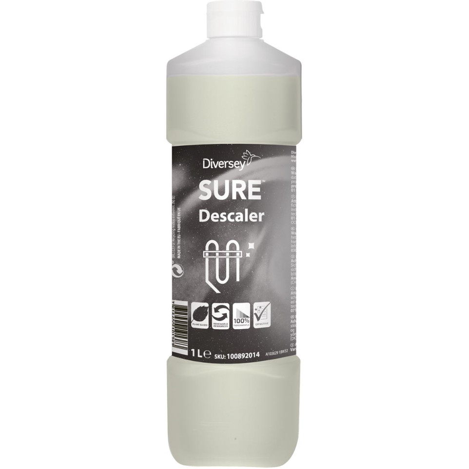 View products in the same categoryDiversey Sure Descaler is a concentrated acid cleaner designed for efficiently removing limescale from kitchen equipment and surfaces. Developed for professional environments, it offers powerful cleaning action while minimizing environmental impact. Supplied in a 1-litre bottle.