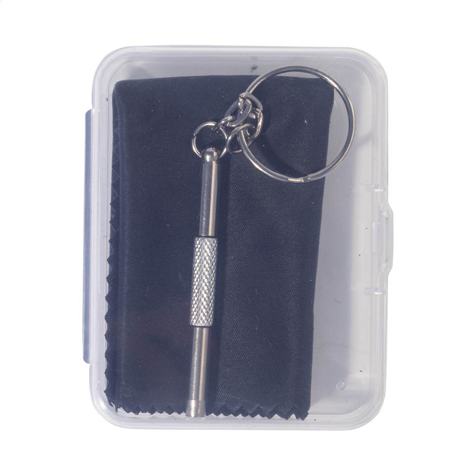 Essential glasses repair and maintenance kit featuring a microfibre cleaning cloth and precision screwdriver, housed in a compact transparent case for convenient storage and portability.