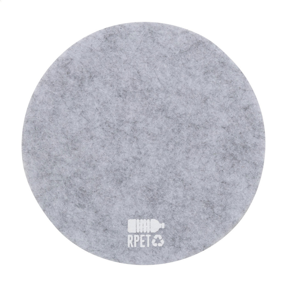 Round RPET felt coaster featuring a distinctive recycled material marker. Perfect for protecting surfaces from drink rings while showcasing eco-friendly values in homes, offices, or hospitality settings.