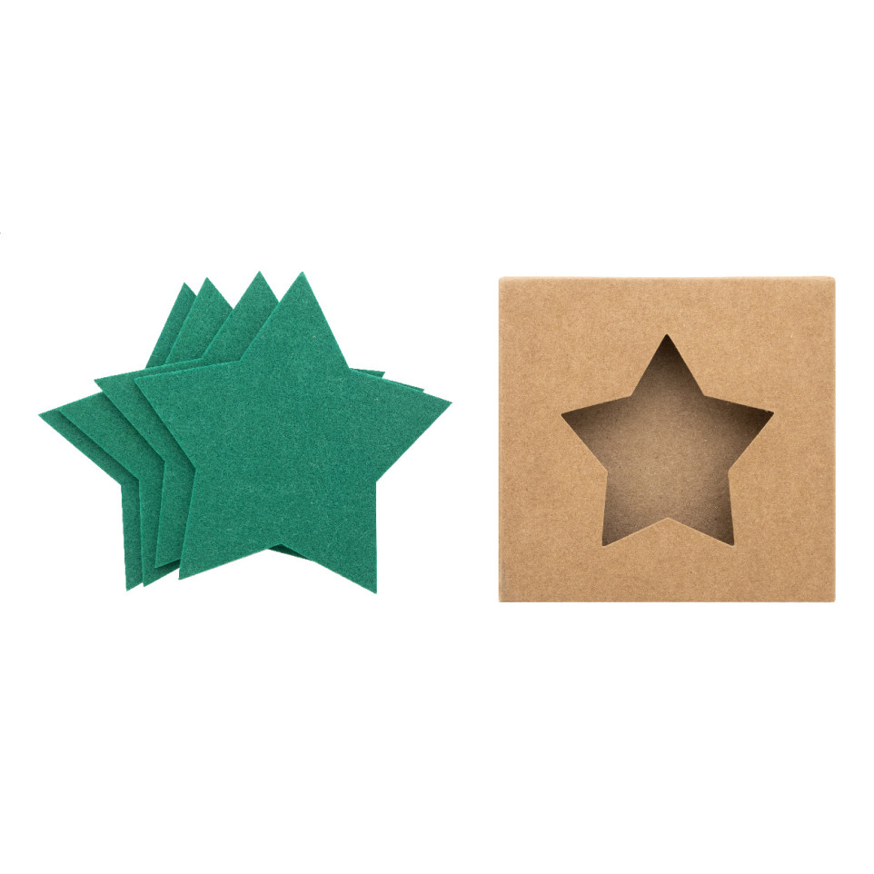 Four-piece Vagnes green Christmas coaster set featuring star-shaped coasters made from RPET felt, neatly packaged in a natural kraft paper box. Ideal for festive gatherings, these coasters protect surfaces while adding a decorative holiday touch.