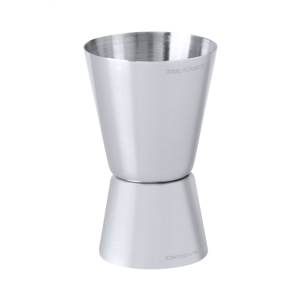 The Robert silver jigger is a sleek, stainless steel bartending tool designed to precisely measure 1 or 1/2 ounce of liquid for crafting perfectly balanced cocktails. This essential bar accessory combines functionality with elegant design.
