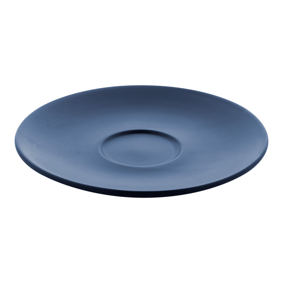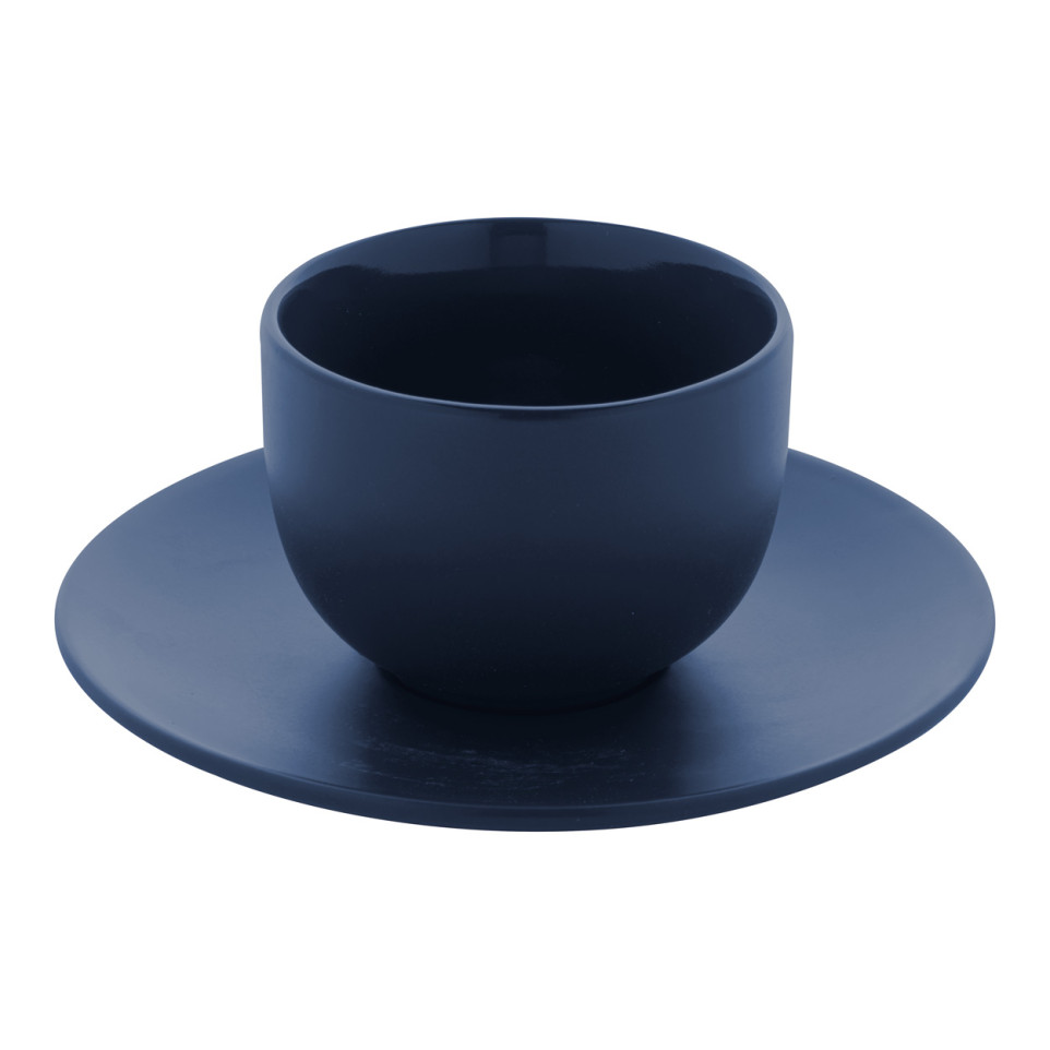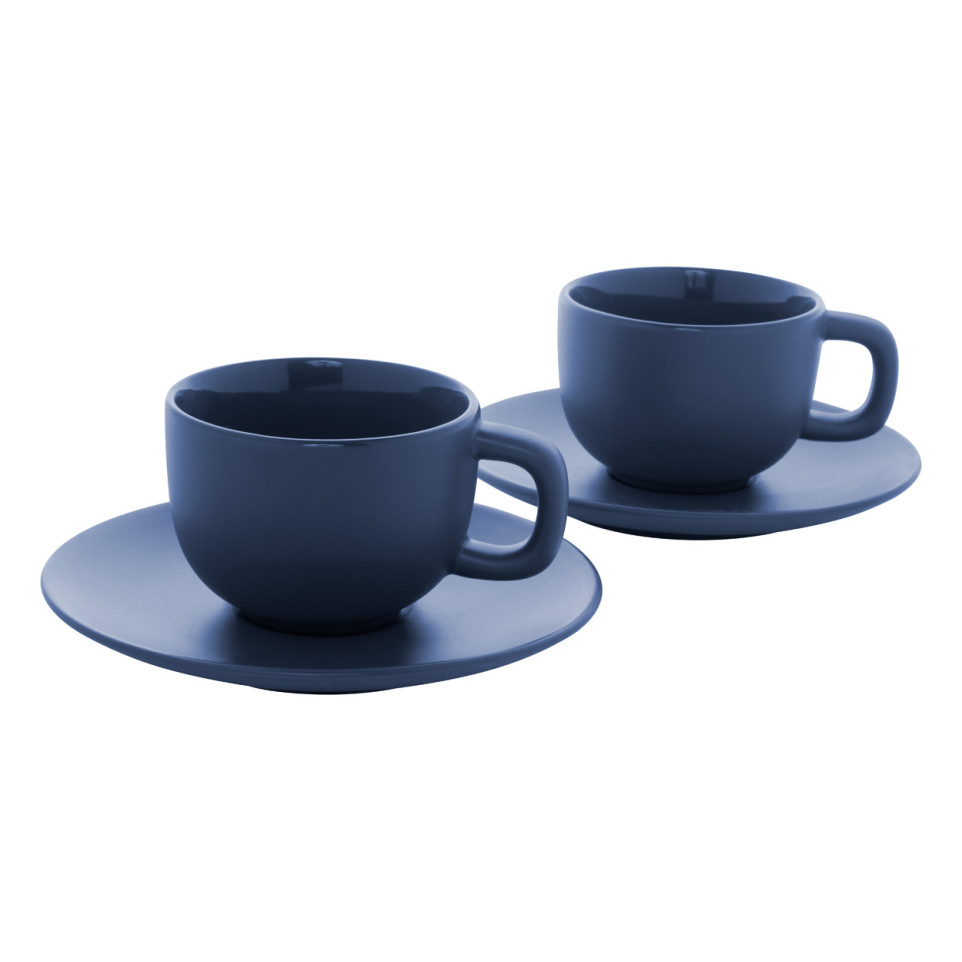 High quality ceramic cappuccino cup set featuring two dark blue cups and matching saucers, each with a 200 ml capacity. Matte finish on the outside and glossy interior provide a refined look, presented in a kraft paper box for easy gifting or office use.