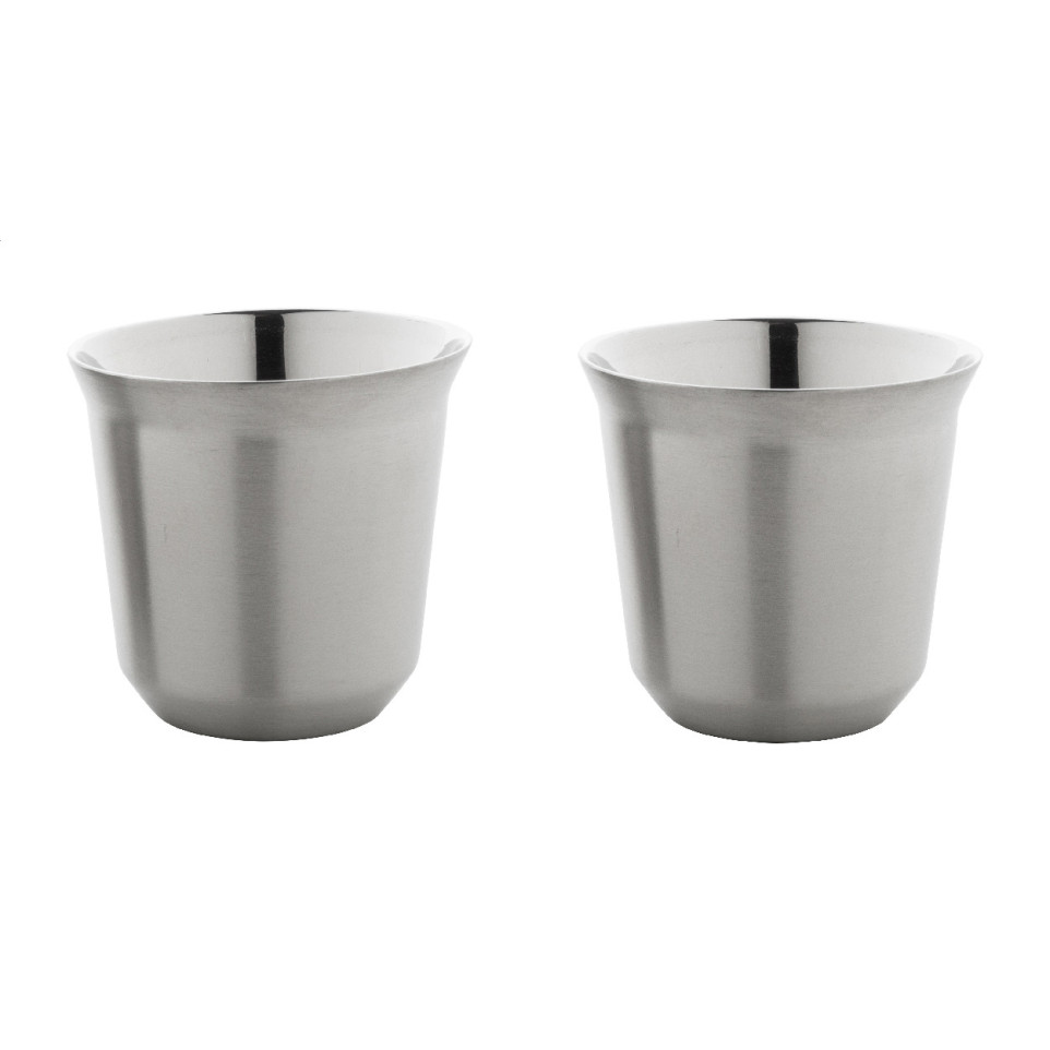 Set of 2 espresso cups shaped like coffee capsules, each with an 80 ml capacity, crafted from double-wall insulated recycled stainless steel to maintain beverage temperature. Ideal for enjoying espresso at home or in the office. Supplied in a kraft paper box.