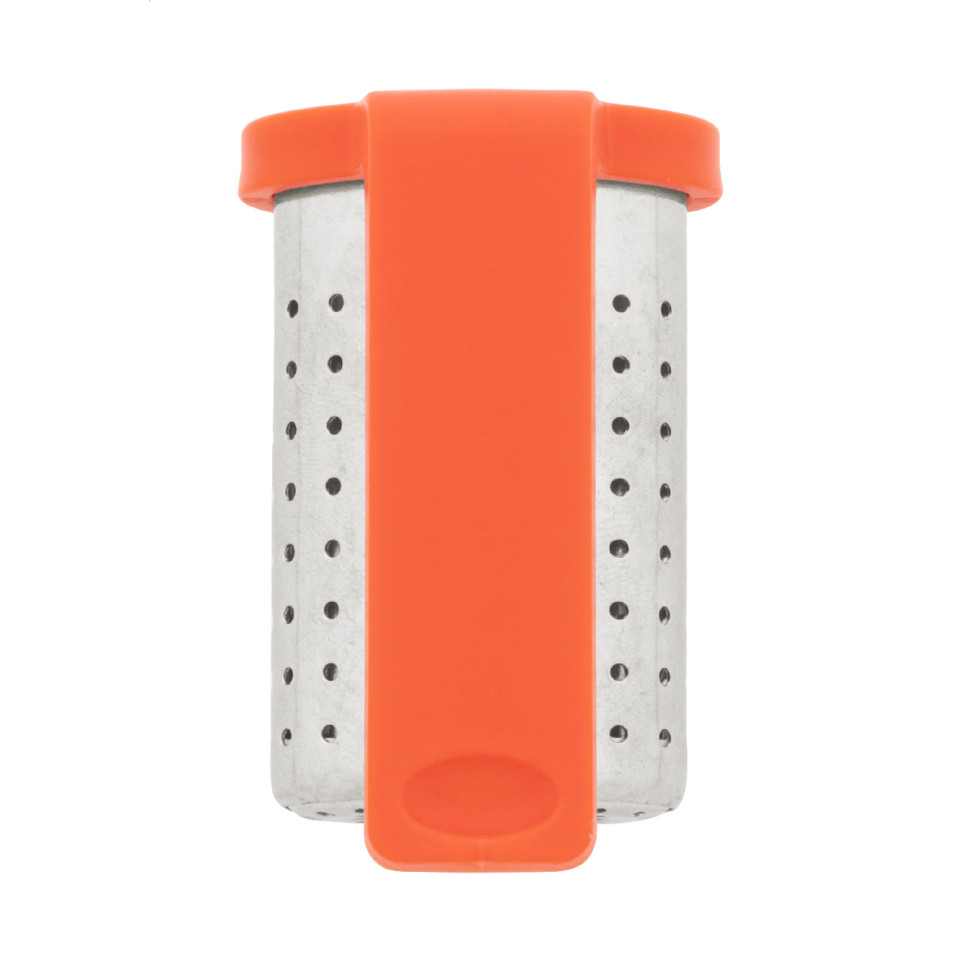 Stainless steel tea infuser with recycled ABS clip holder designed to attach securely to the rim of a mug, ideal for preparing loose leaf tea comfortably at home, work, or on the go.