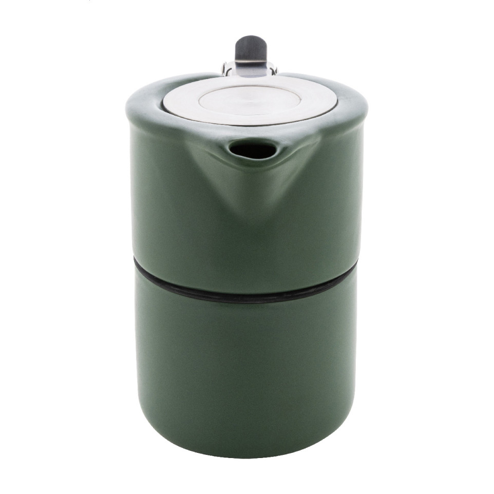 Ceramic tea set with matte finish, featuring a 430 ml teapot with stainless steel lid and tea strainer, designed to stack seamlessly on the included 400 ml mug. Delivered in a kraft paper box for gifting or professional use.