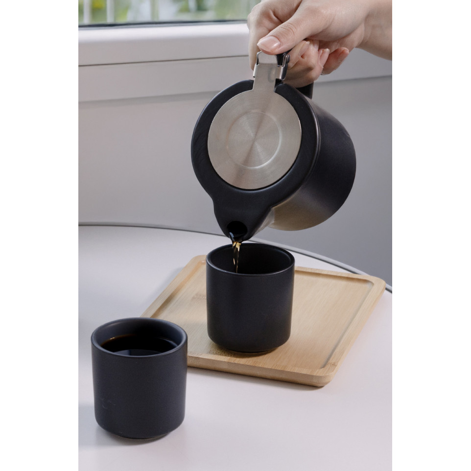 High quality ceramic tea set featuring a matte finish and an elegant bamboo serving tray. Includes a 500 ml teapot with stainless steel lid and integrated tea strainer, accompanied by two 150 ml cups. Designed for an enhanced coffee or tea experience at home or in the office.