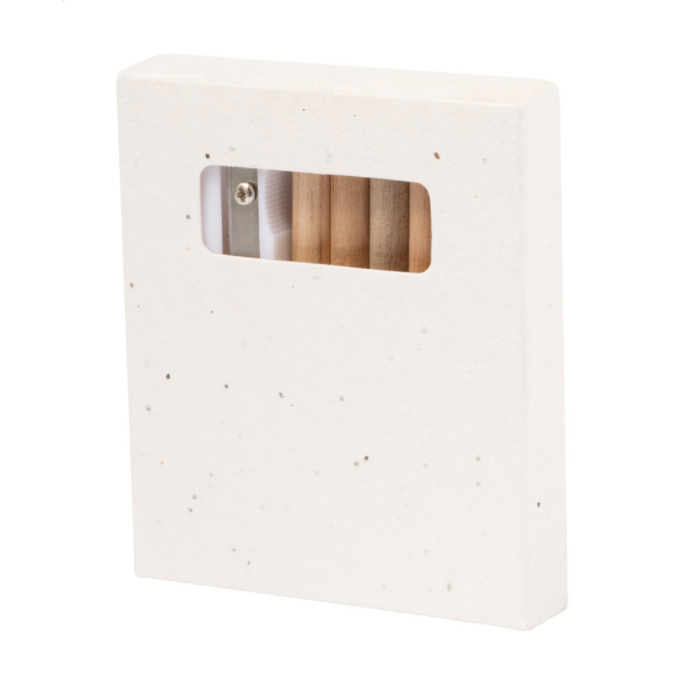 What makes this coloring set environmentally friendly? The Selanis set features wooden pencils and a box made from seed paper containing petunia seeds that can be planted after use.